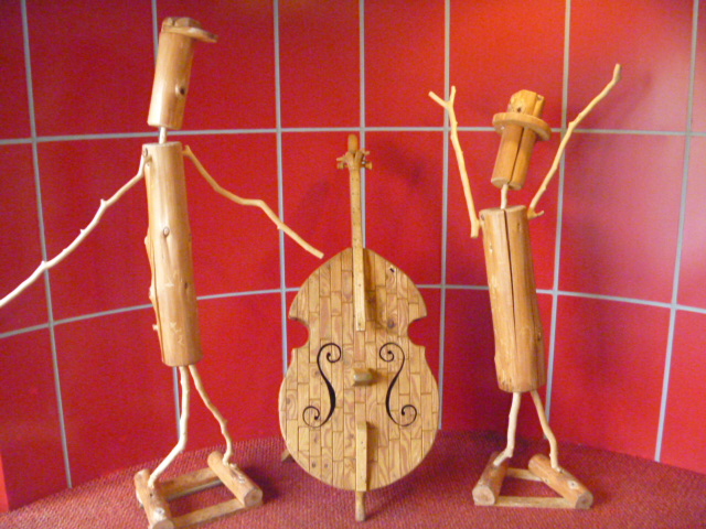 ひげ面の店主がストーブに太い薪を入れているときに